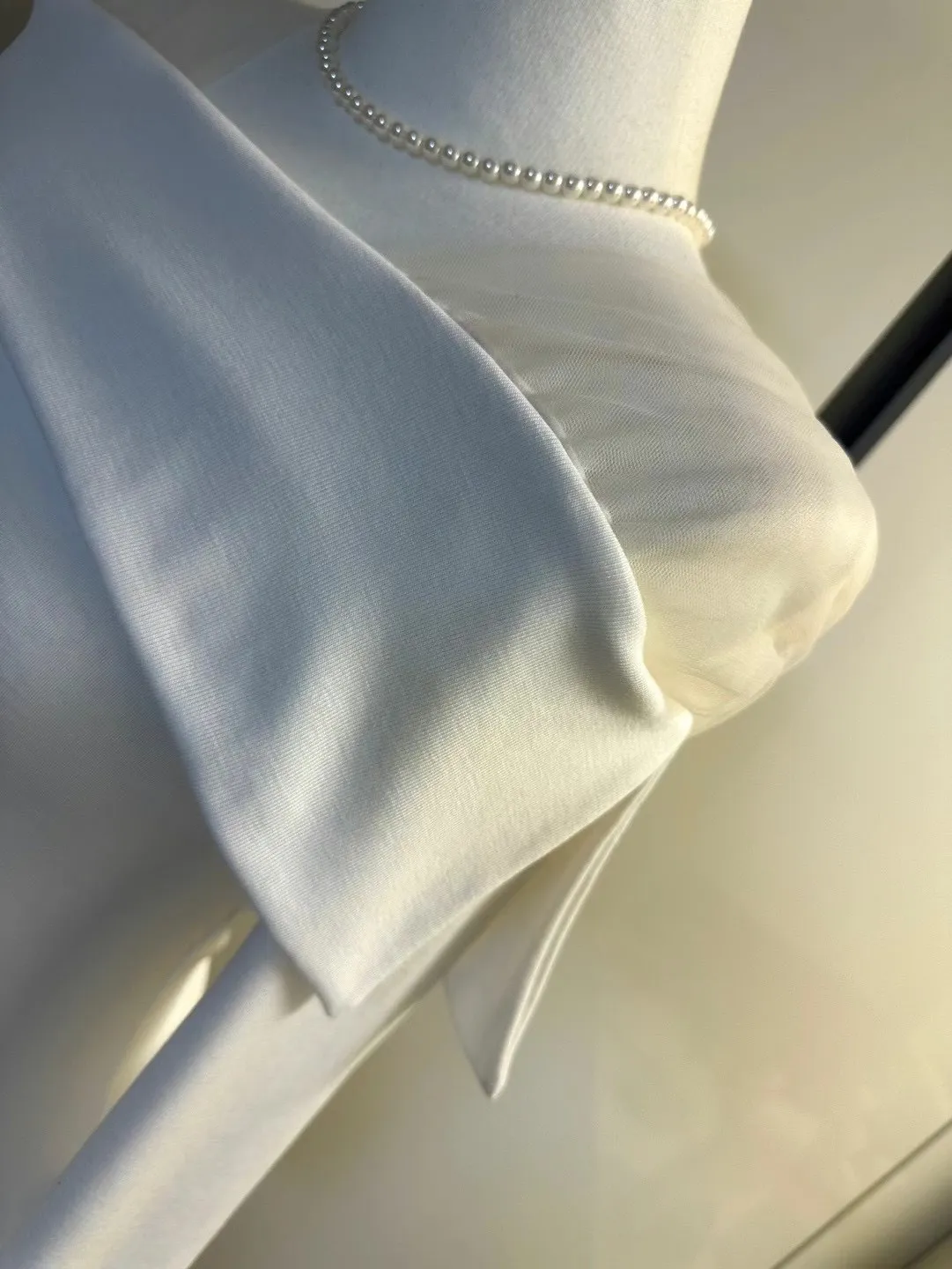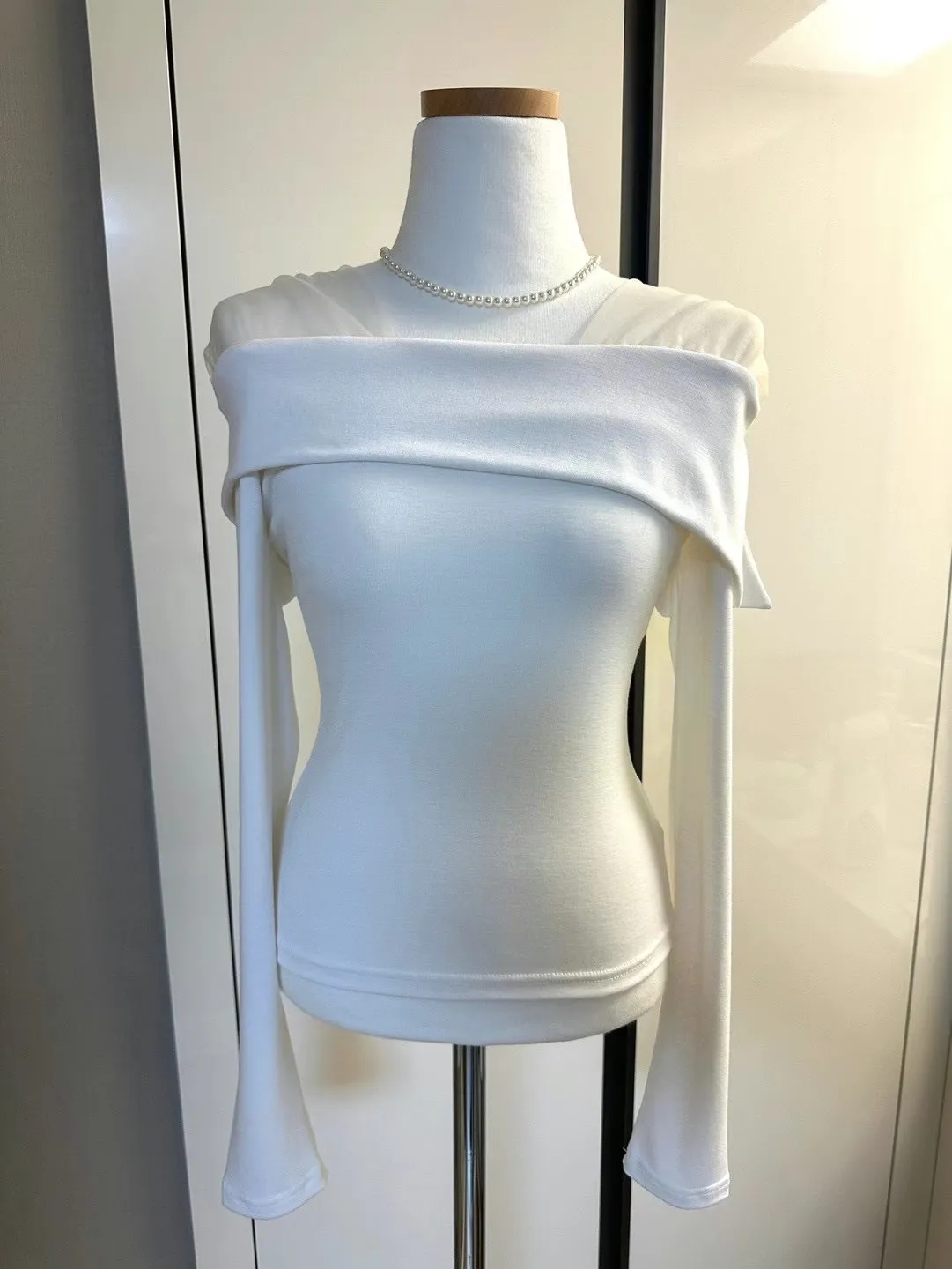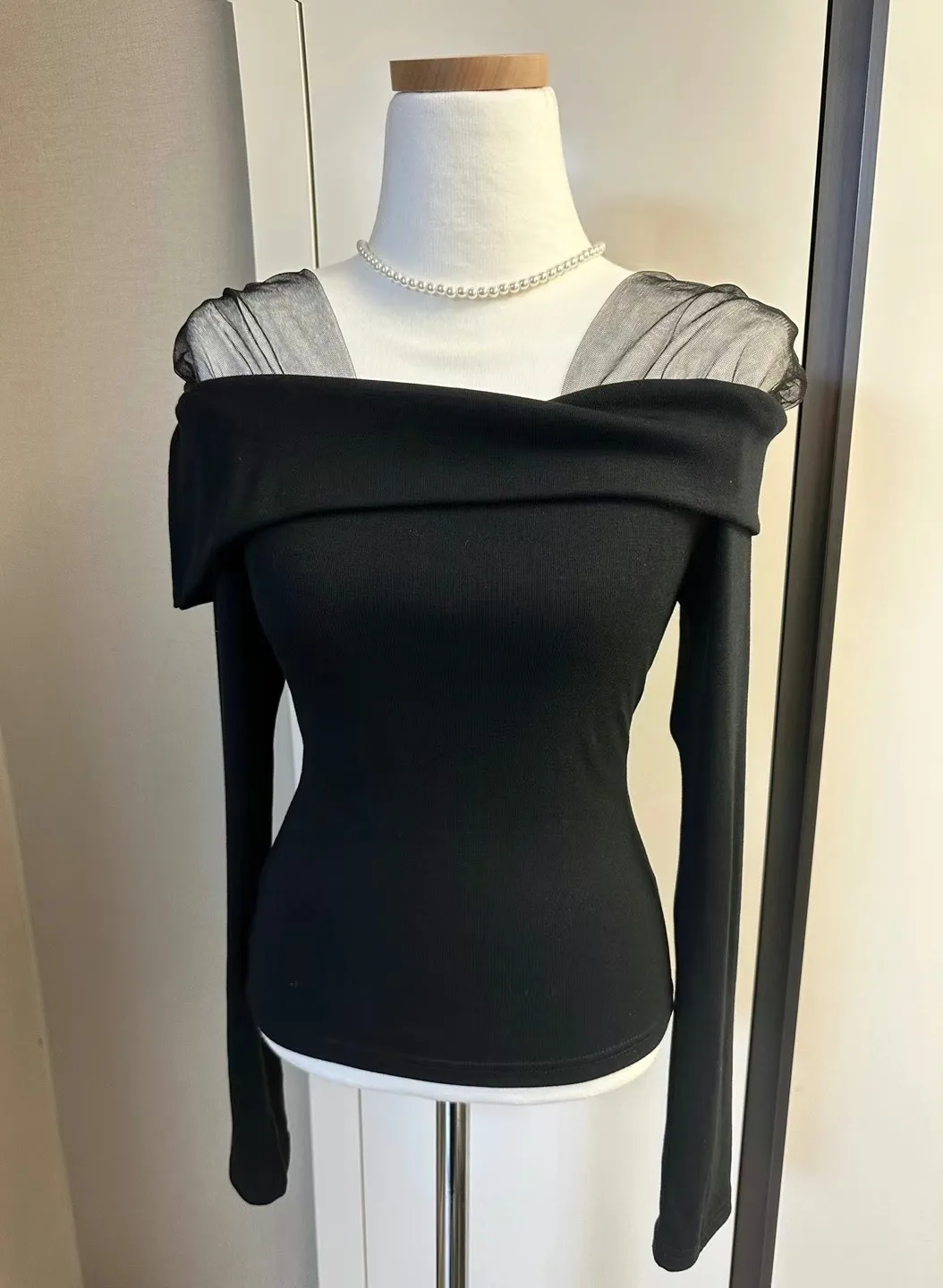 (早春溫柔上衣新款)肩帶網紗一字翻領上衣