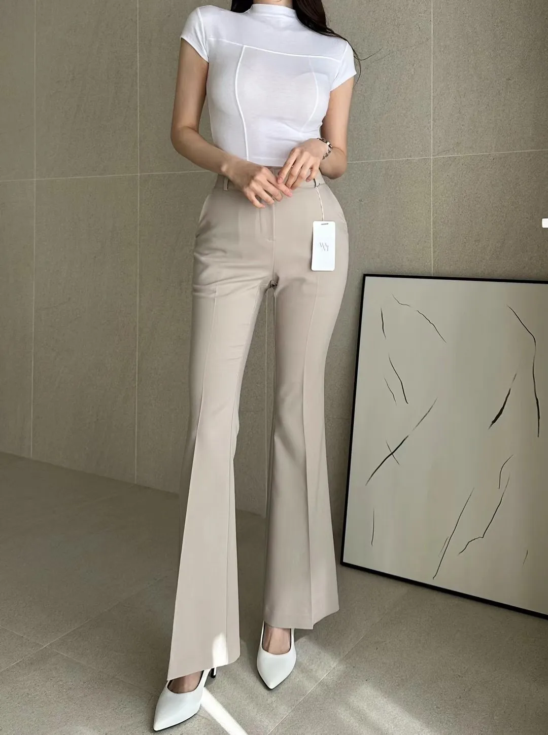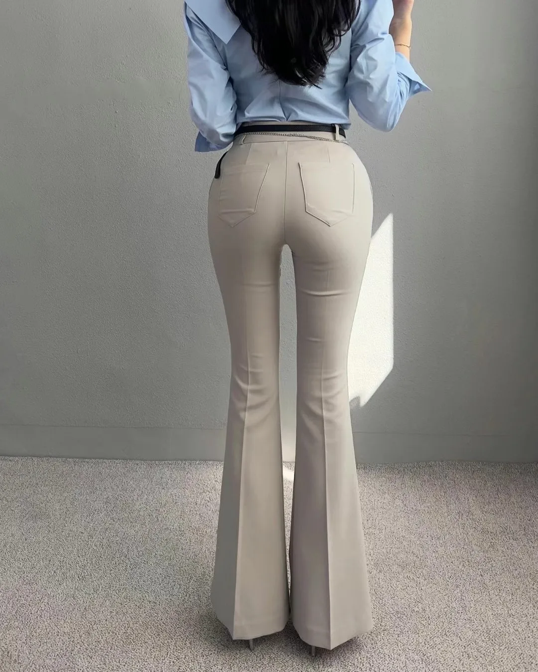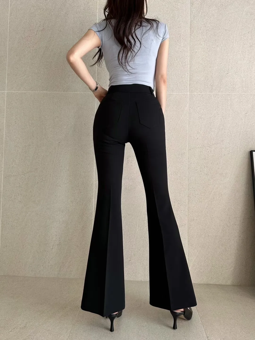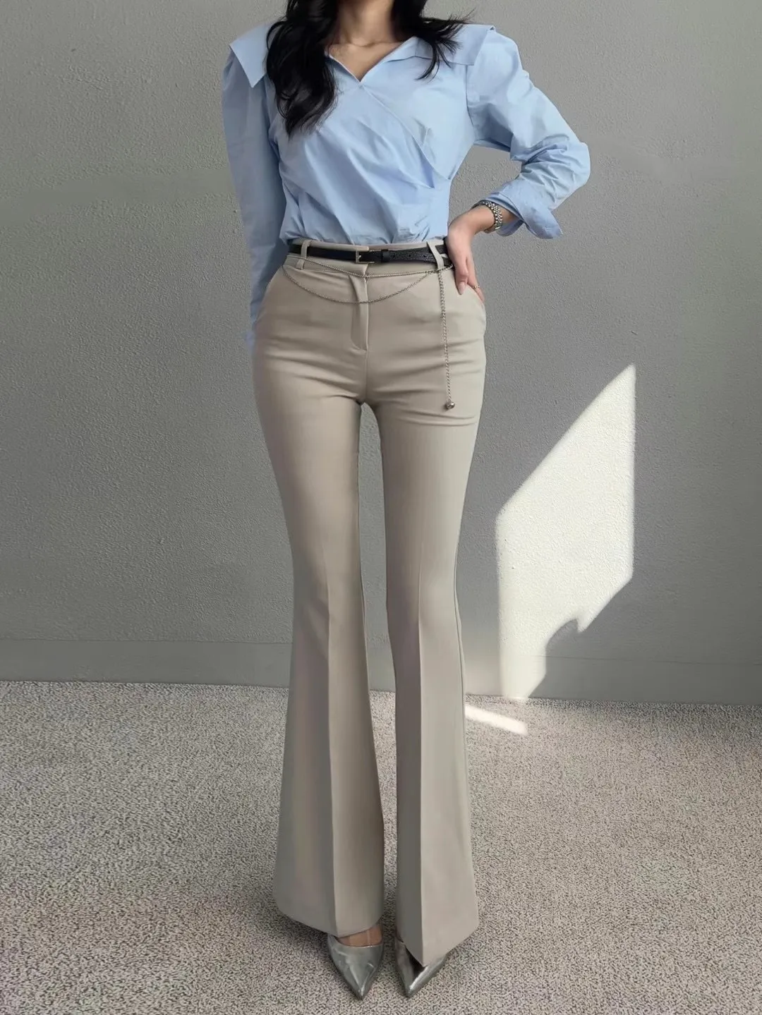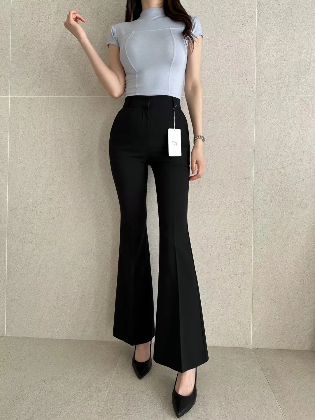 (漫畫身材秘密款)壓褶西裝長腿喇叭褲