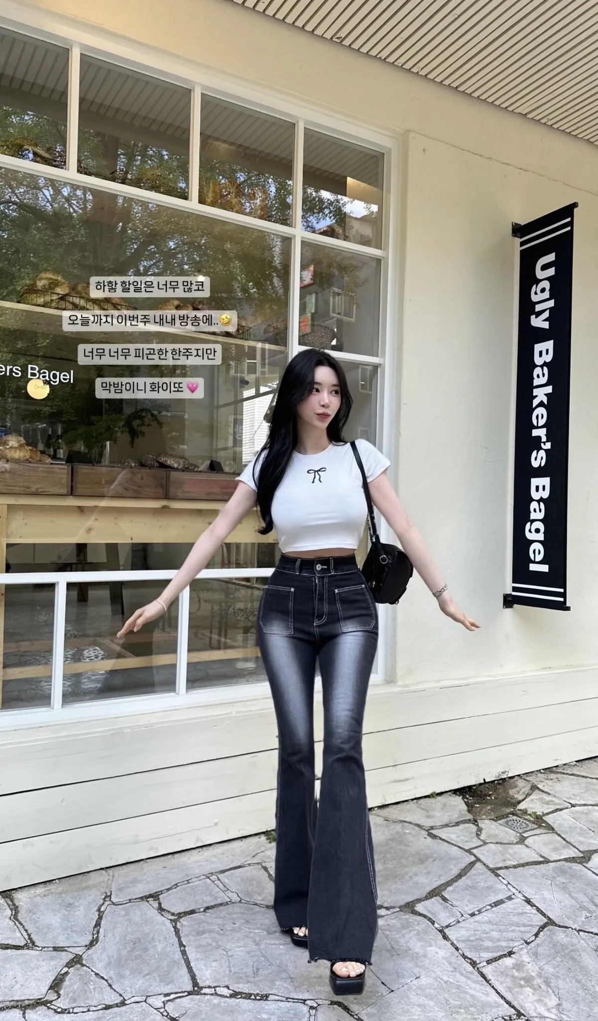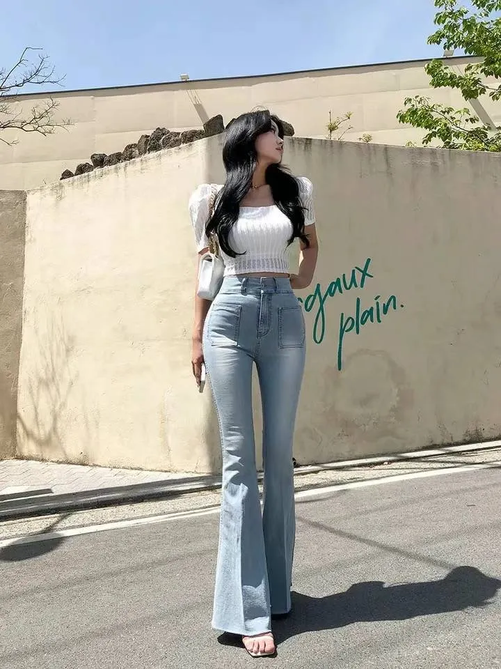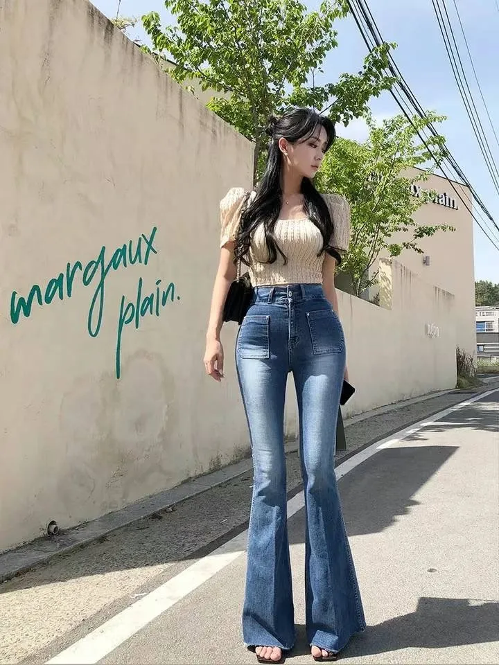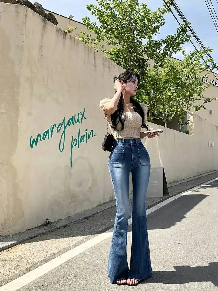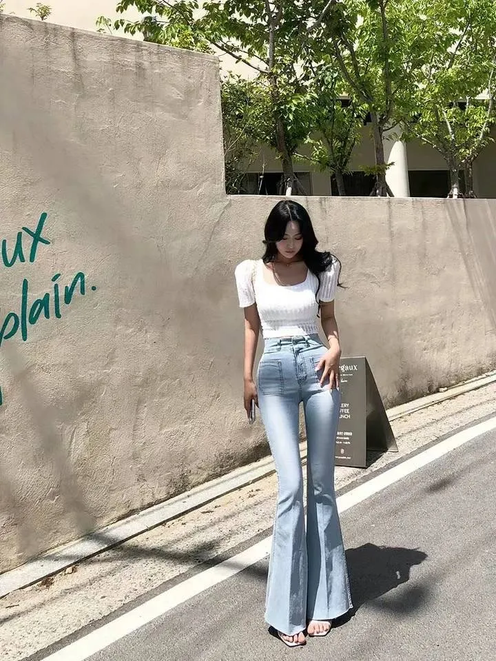 (04.23Korea韓國親飛連線)刷色顯瘦大長腿壓褶牛仔喇叭褲