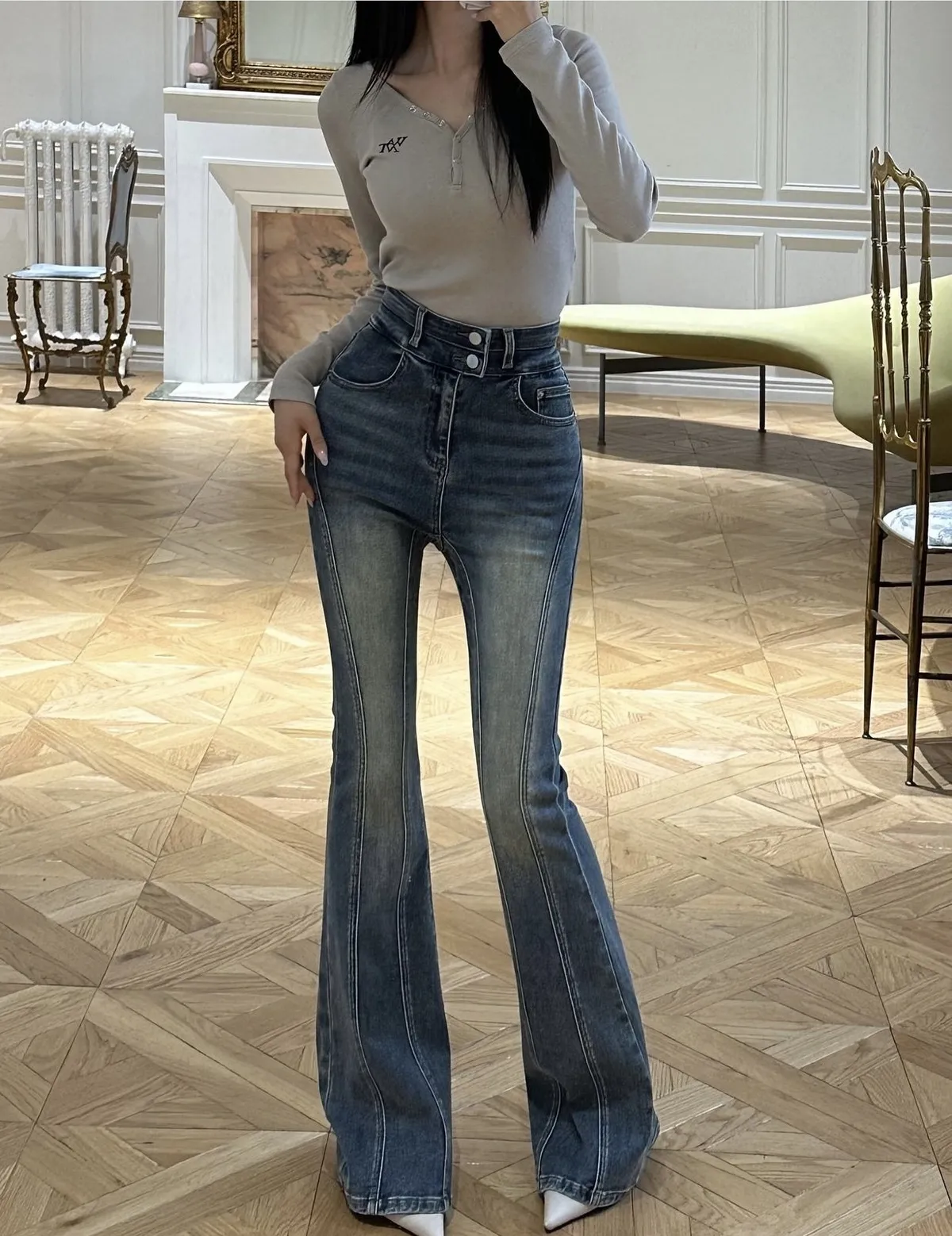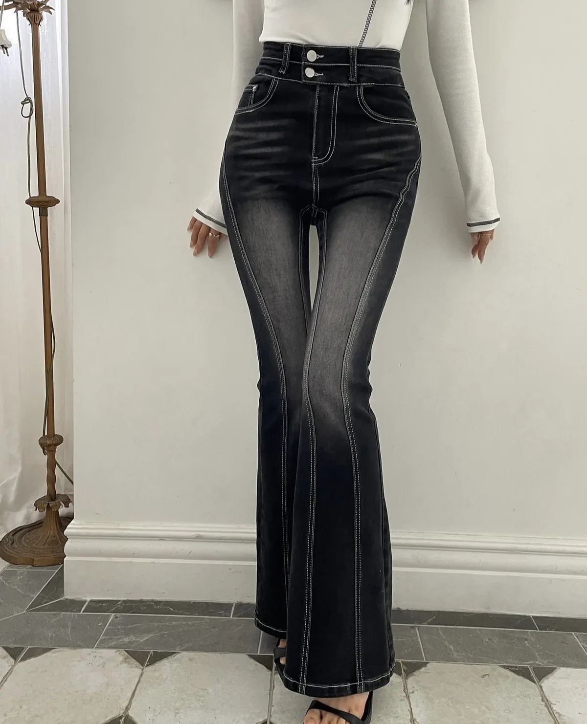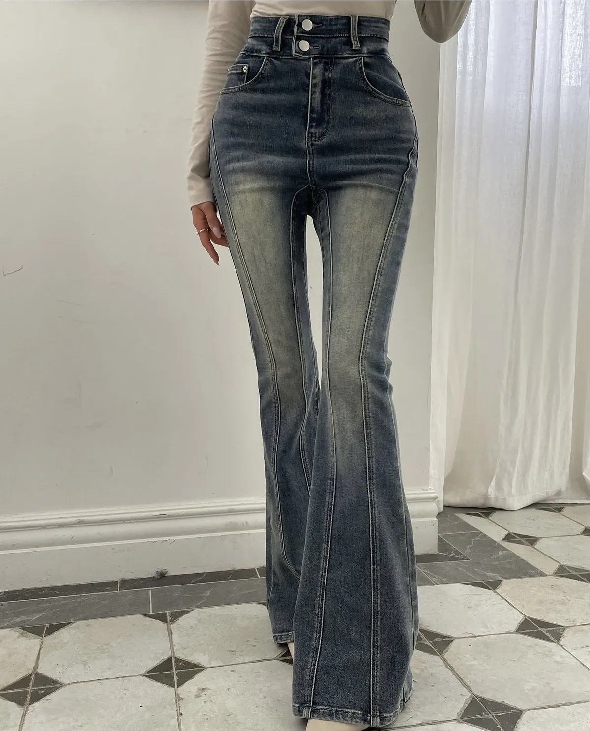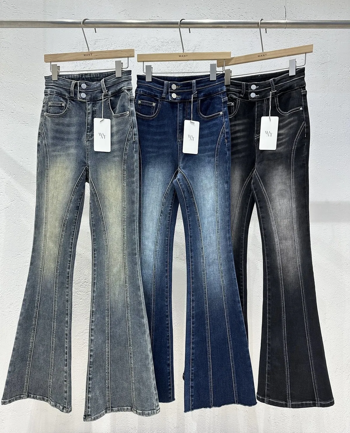 (必買款)彈力復古刷色車縫線設計款喇叭褲