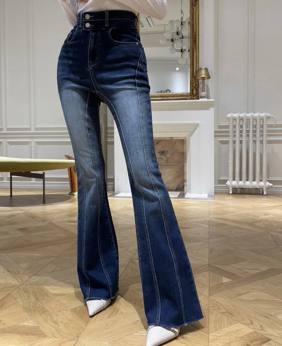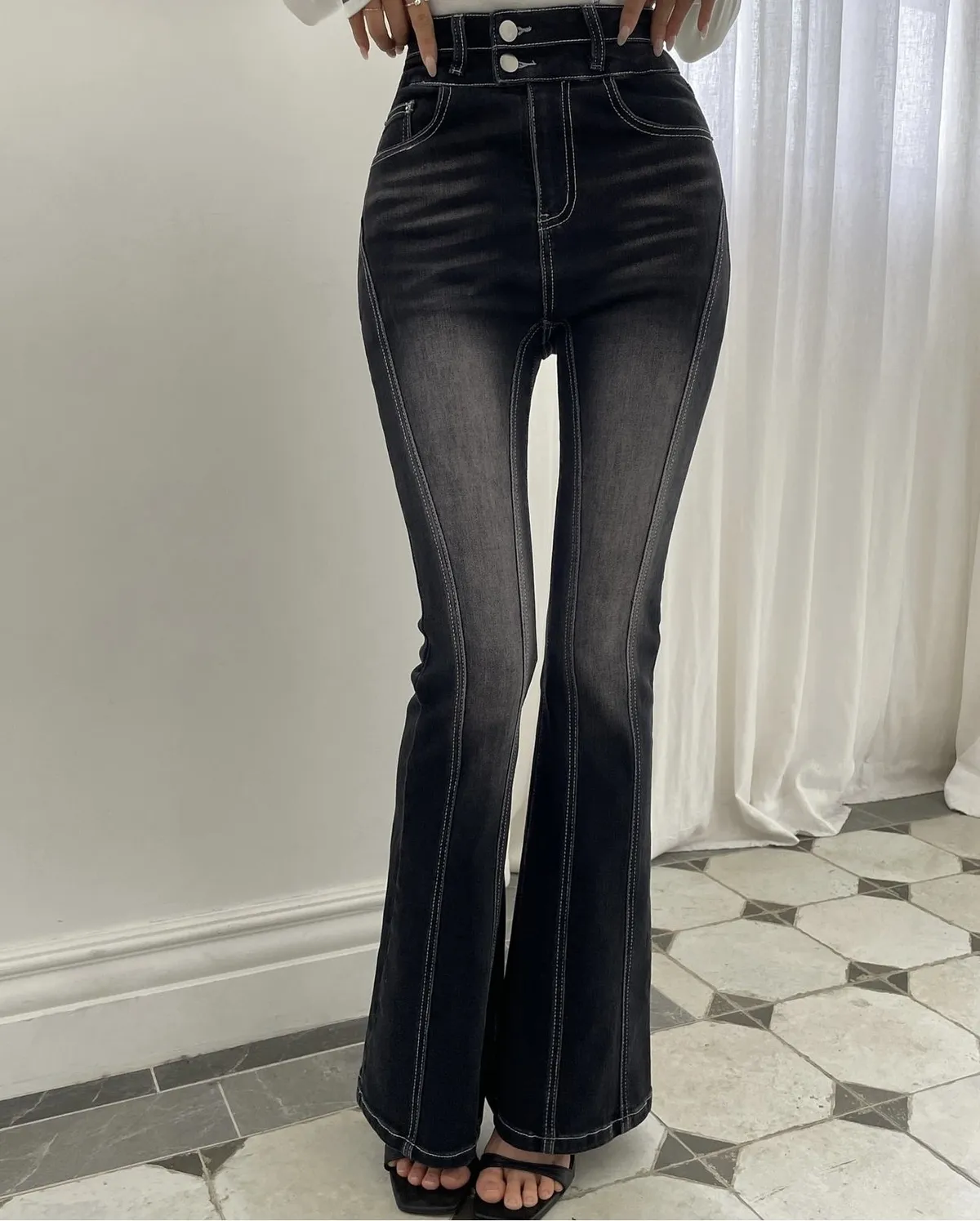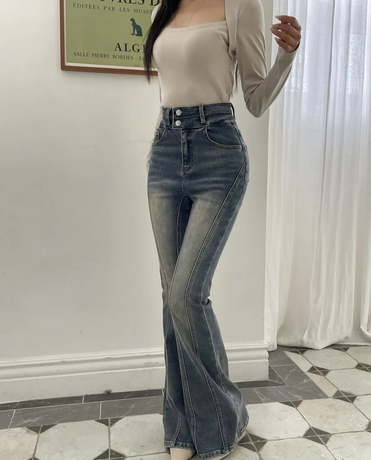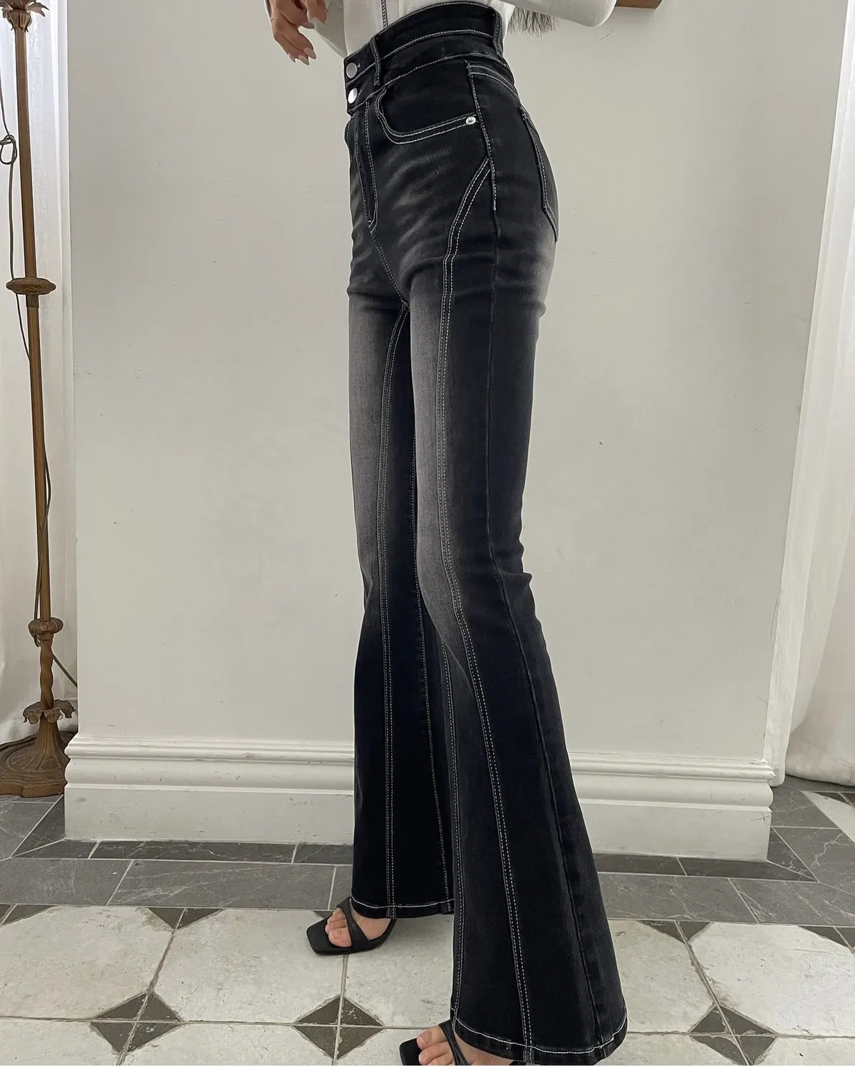 (必買款)彈力復古刷色車縫線設計款喇叭褲