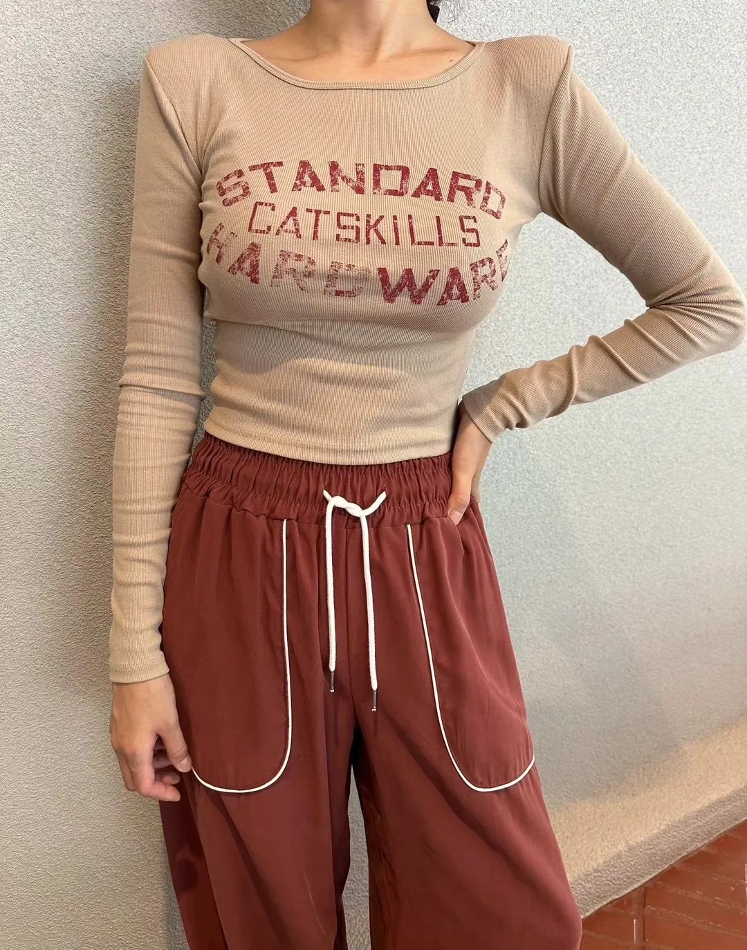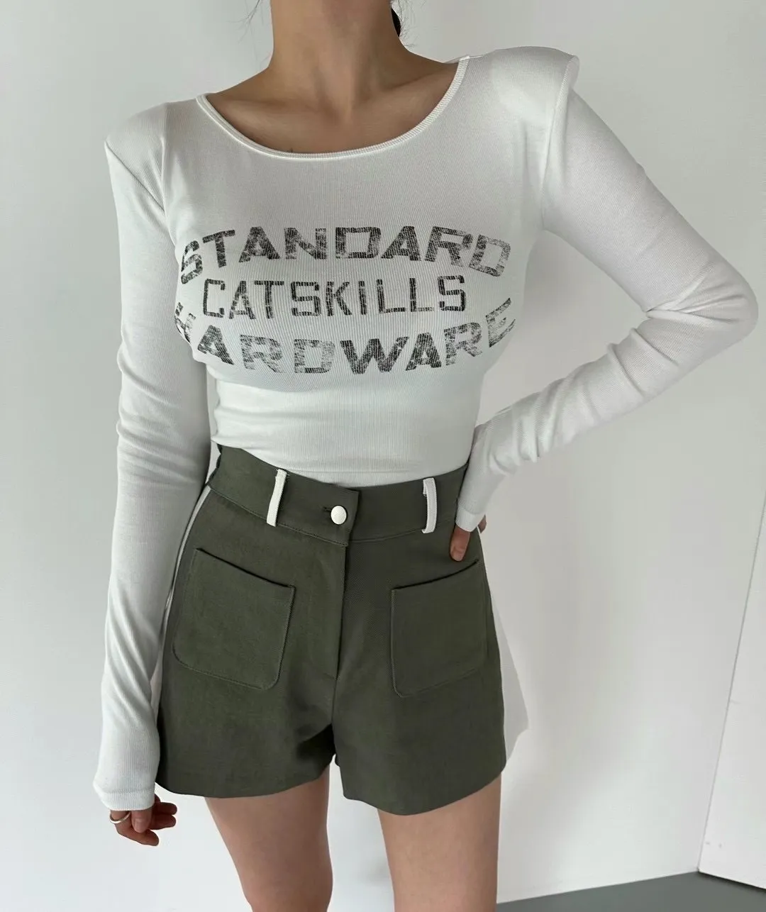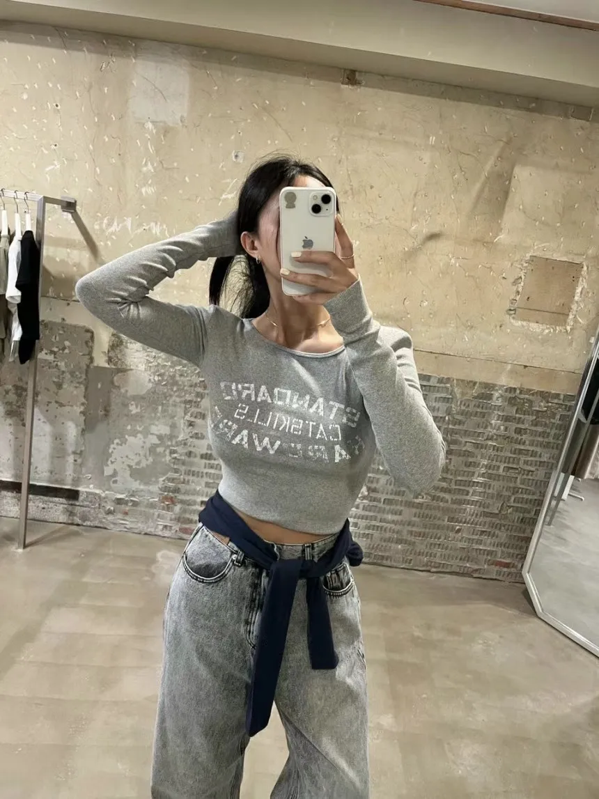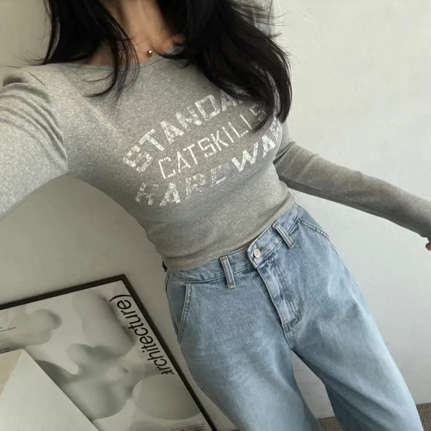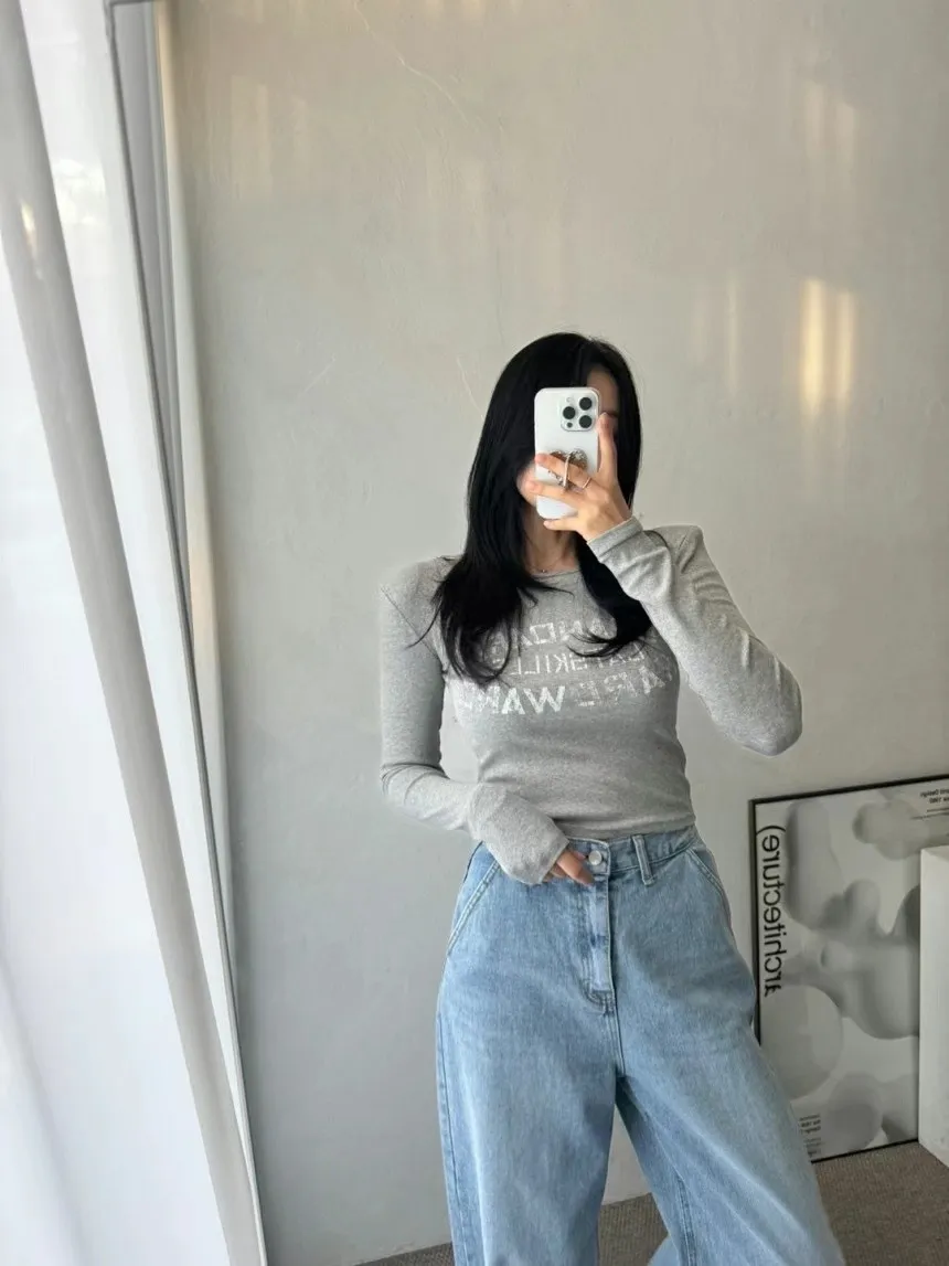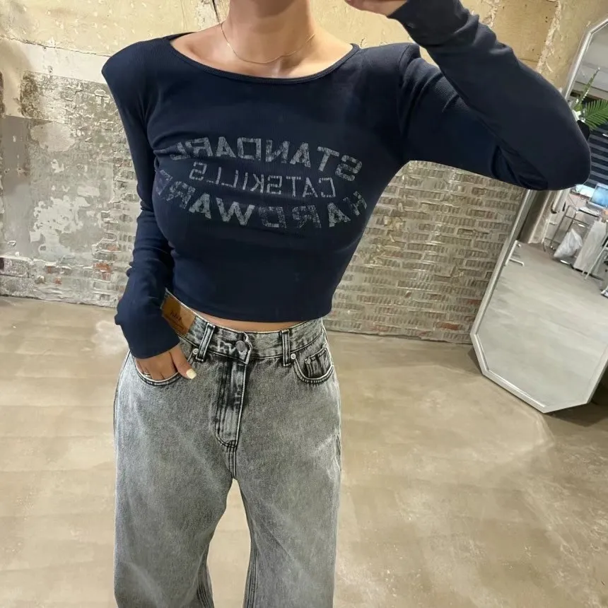 【現貨出清款】字母刷舊圓領彈力墊肩上衣