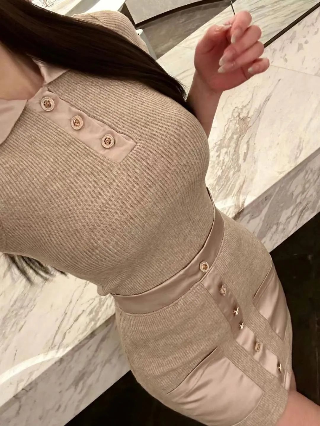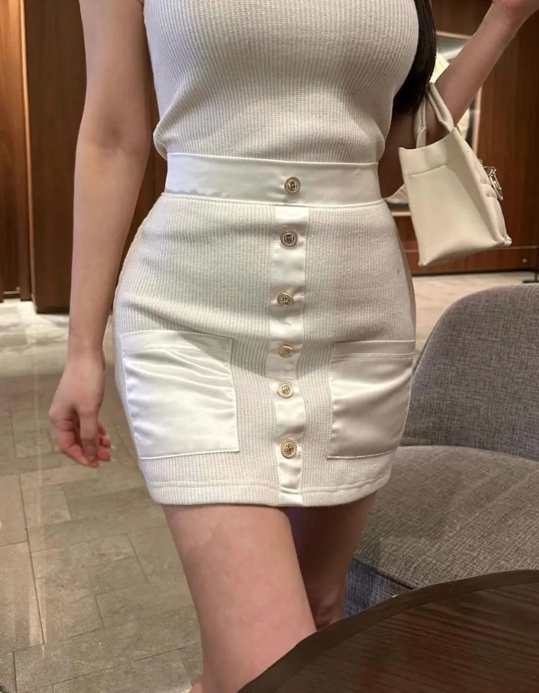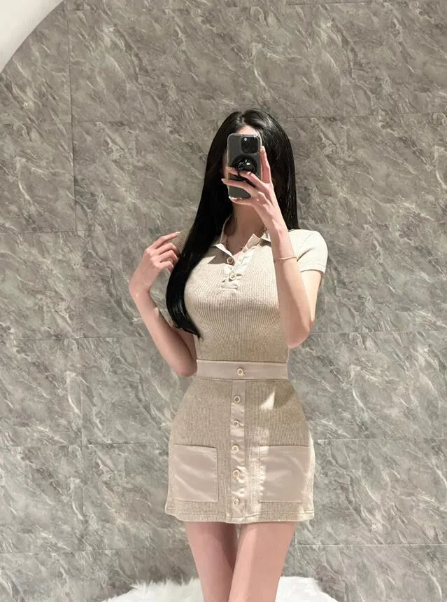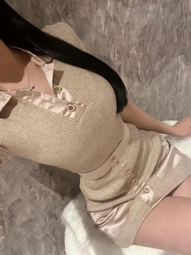 珍珠緞面領口針織衫兩截式溫柔套裝